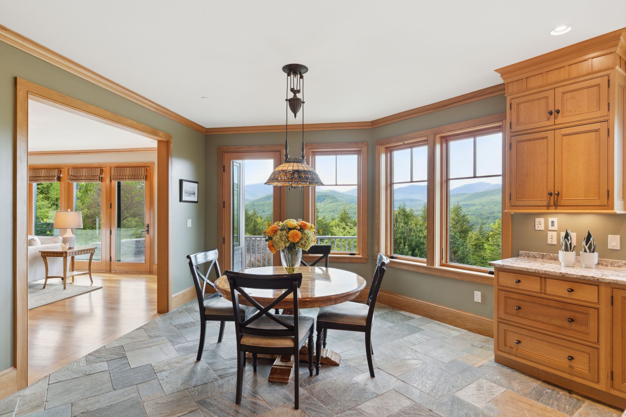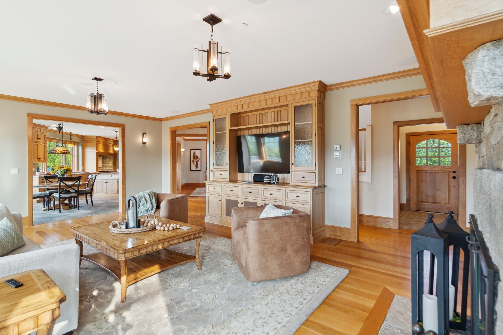 At the heart of the home, a warm and inviting living room is anchored by a striking granite stone fireplace, setting the tone for both relaxation and entertaining. Adjacent to the living room, a cozy library with its own stone fireplace offers an intimate space to unwind—ideal for quiet evenings or après-ski gatherings. The expansive eat-in kitchen is a true showpiece, designed with both style and function in mind. It features a center island with seating for four, a generous scullery, and well-appointed formal and casual dining areas, all flowing effortlessly to accommodate gatherings both large and small.